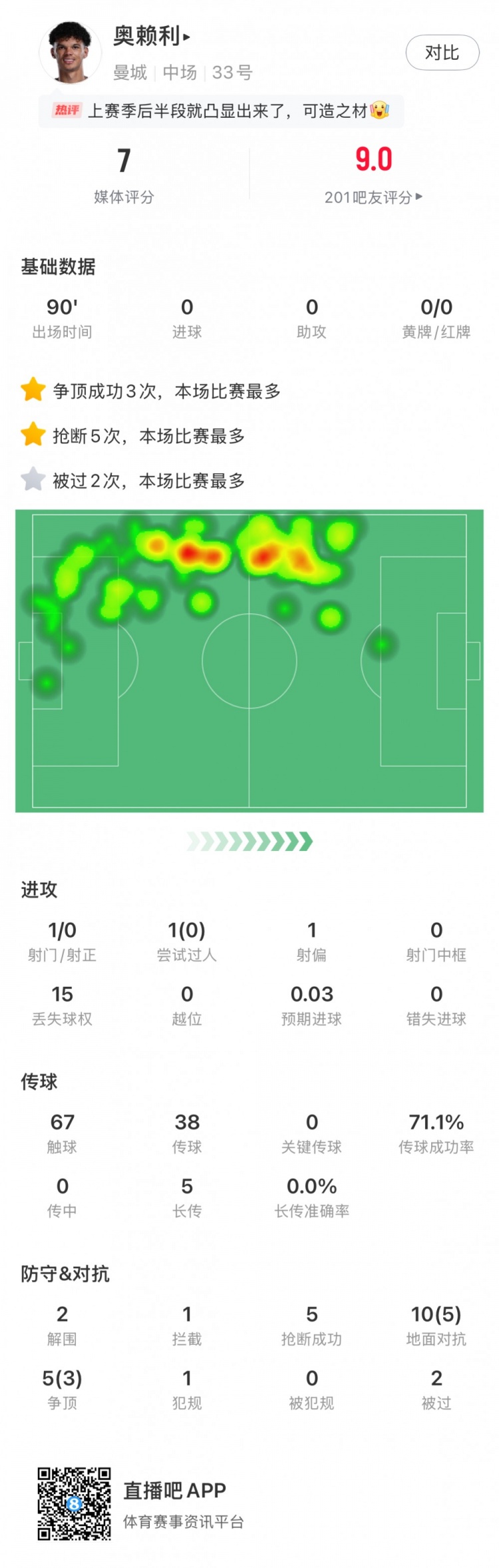 9月15日訊 英超第4輪曼市德比,曼城主場3-0擊敗曼聯(lián),奧賴?yán)艘鄢鋈温亲蠛笮l(wèi)打滿全場,球員數(shù)據(jù)如下: