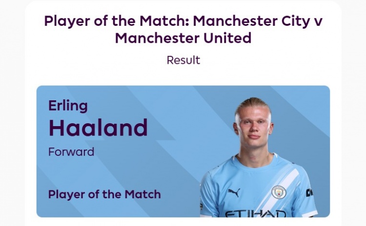 據(jù)賽后英超官網(wǎng)報道,哈蘭德當選此役全場最佳球員,獲得82%的投票。