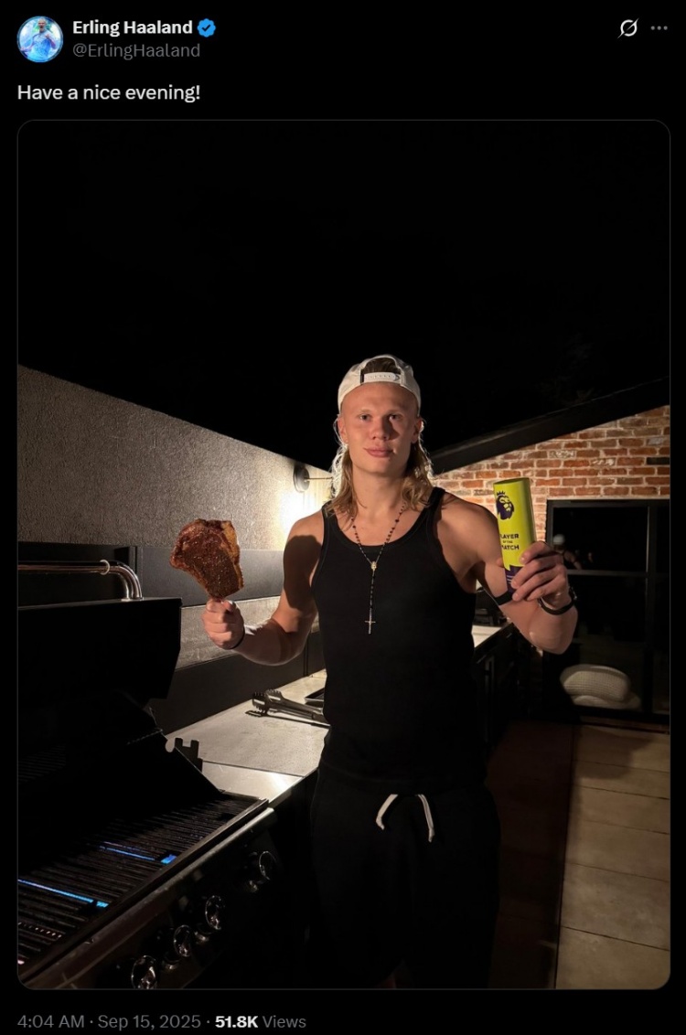 賽后這名前鋒更新社媒,一身休閑裝扮,手拿烤肉與英超官方全場最佳球員獎(jiǎng)杯。