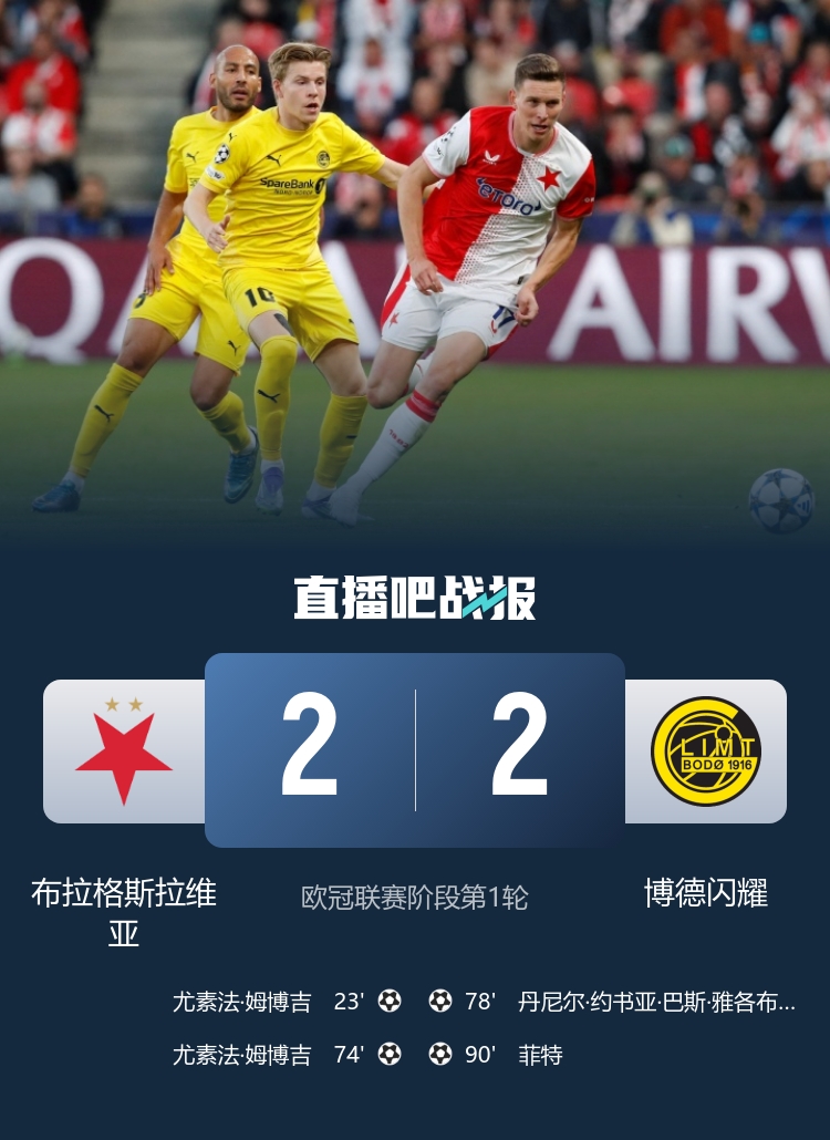 下半場(chǎng)補(bǔ)時(shí)7分鐘,布拉格斯拉維亞2-2博德閃耀。