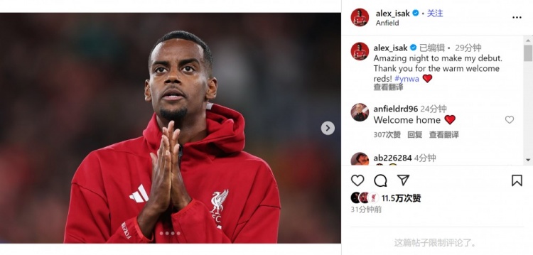 此役伊薩克首發(fā)出戰(zhàn),上演利物浦首秀,賽后他在社交媒體上寫道:“在美妙的夜晚迎來我的首秀,感謝紅軍球迷們的熱情歡迎!ynwa??”