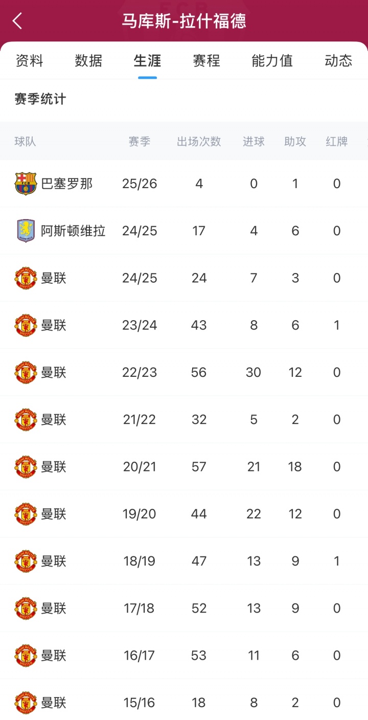 拉什福德近兩個(gè)賽季表現(xiàn)不佳,上賽季被曼聯(lián)租借至維拉,今夏再次被外租至巴薩。