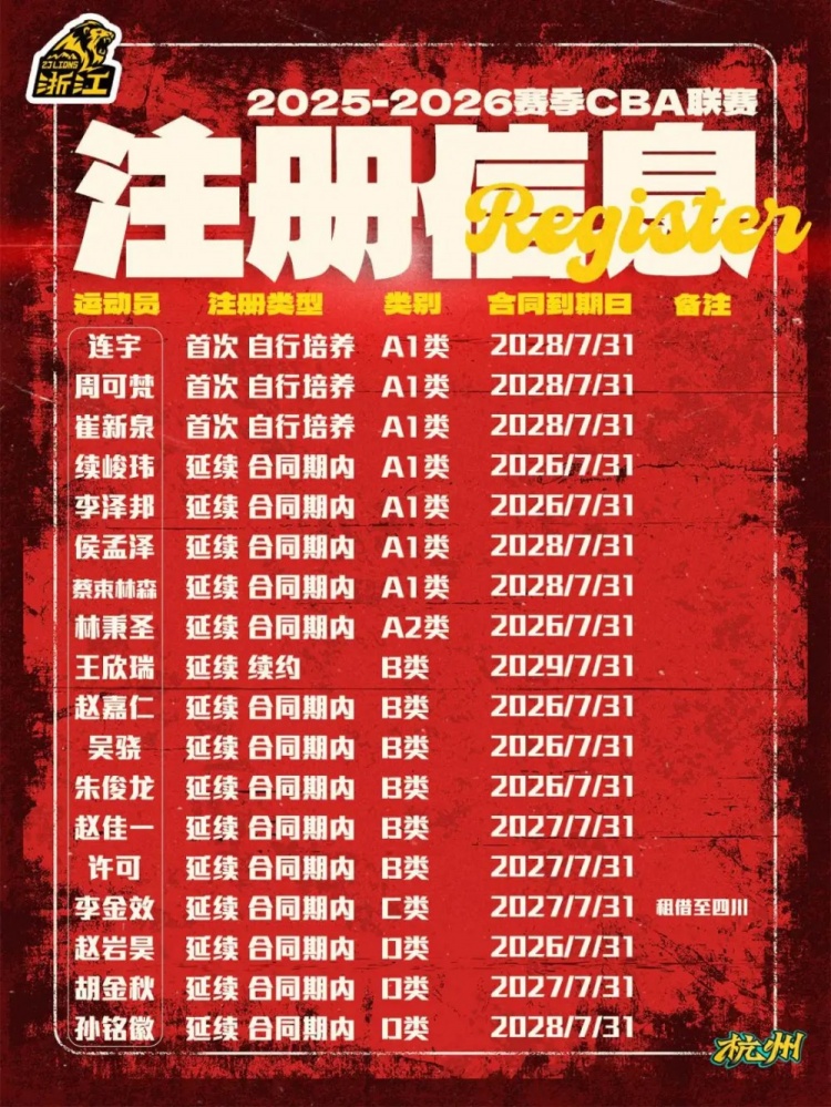 9月1日訊 浙江廣廈官宣球隊(duì)完成了2025-26賽季的國(guó)內(nèi)球員注冊(cè)工作,詳情如下: