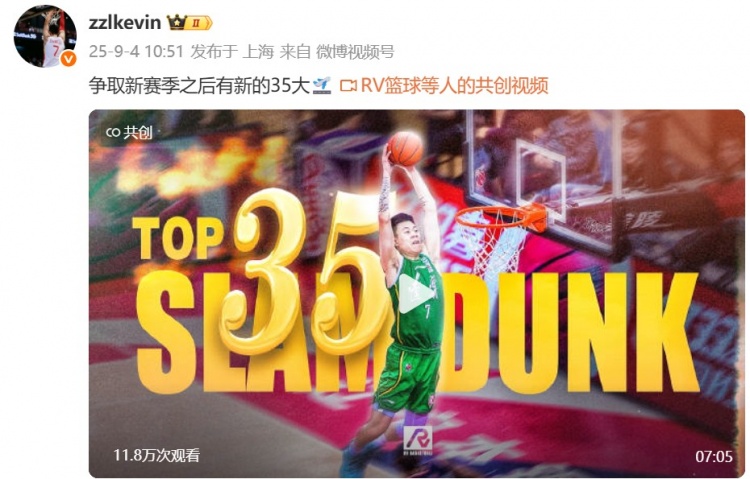 9月4日訊 上海男籃球員張鎮(zhèn)麟更新社媒,曬出自己的35大扣籃。