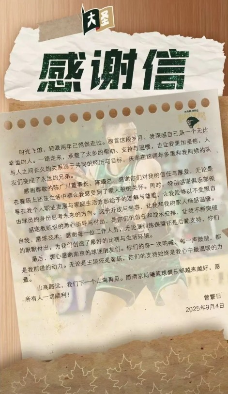 曾繁日發(fā)文感謝了同曦男籃,他表示特別感謝俱樂部讓其成為不受限制的自由球員。