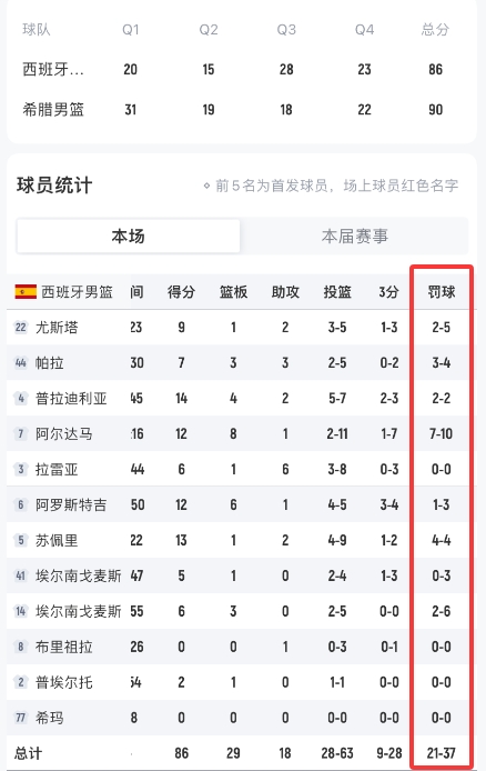 此役,西班牙全隊獲得37次罰球,比對手希臘高出16次,但西班牙罰丟16個,最后時刻更是頻頻失手。