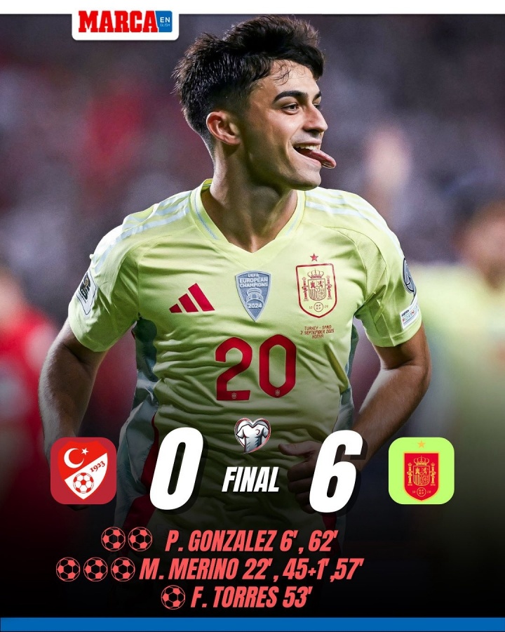 西班牙6-0大勝土耳其,巴薩22歲中場(chǎng)核心佩德里打入兩粒進(jìn)球。
