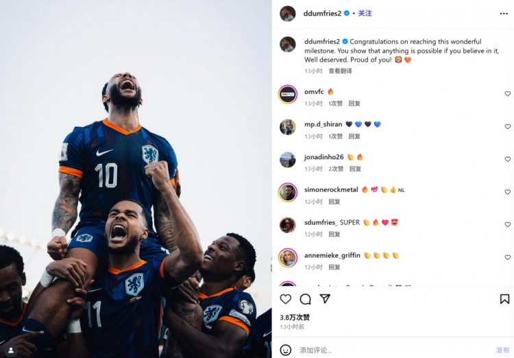 鄧弗里斯也在賽后通過(guò)社媒曬出了德佩的慶祝照,并配文:“祝賀達(dá)成這一非凡的里程碑。你證明了,只要堅(jiān)信自己,一切皆有可能。這是你應(yīng)得的,為你感到驕傲!????”