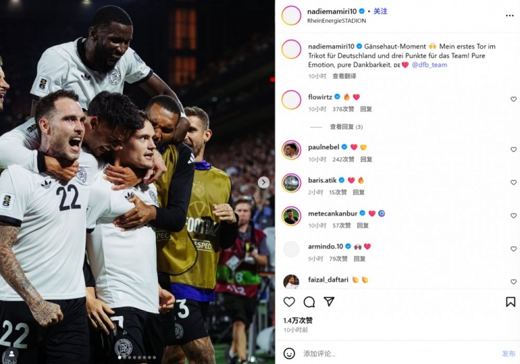 他也在賽后通過社媒曬出全隊的慶祝照,并配文:“真是讓人雞皮疙瘩都起來了??我身披德國隊戰(zhàn)袍的首粒進球,為球隊贏下了三分!無比激動,無比感恩?!?/p>