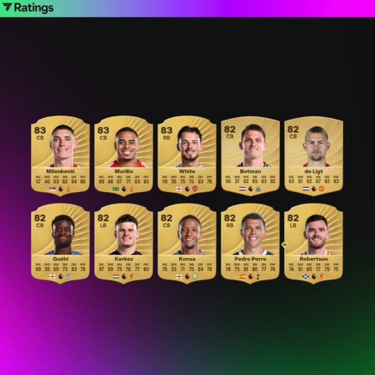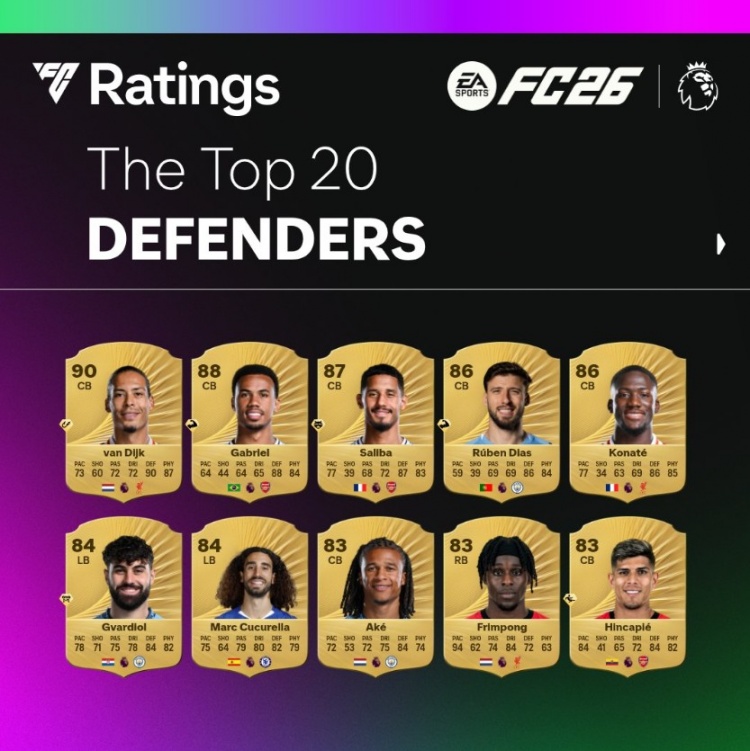 9月9日訊 FC26公布了英超評分前20后衛(wèi)榜單,范迪克90分居首,加布里埃爾88分次之。