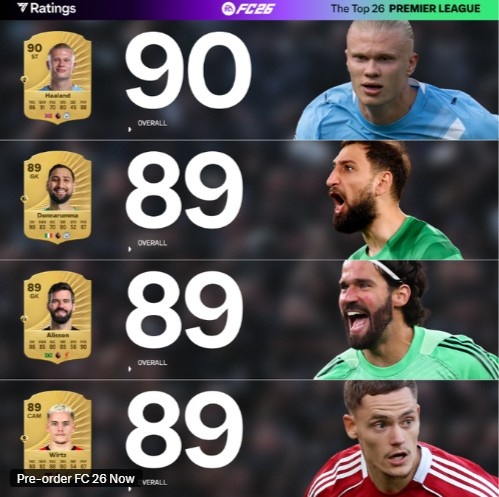 9月9日訊 FC26公布了英超評(píng)分前26位球員榜單,薩拉赫91分居首,羅德里、范迪克、哈蘭德90分次之。