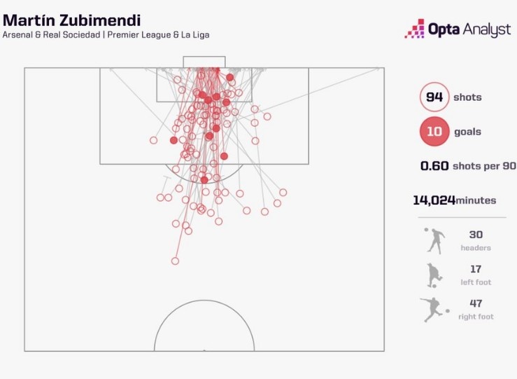 據(jù)統(tǒng)計,這是蘇維門迪在頂級聯(lián)賽生涯首次打進(jìn)禁區(qū)外的遠(yuǎn)射,他在為皇家社會和阿森納效力的比賽中94次射門打進(jìn)10球,但是首次打進(jìn)遠(yuǎn)射。