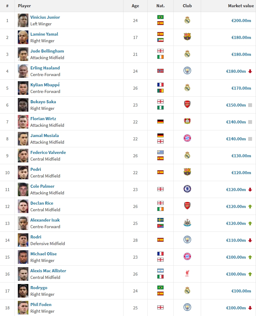 附現(xiàn)今足壇18位“億元先生”(單位:歐元):