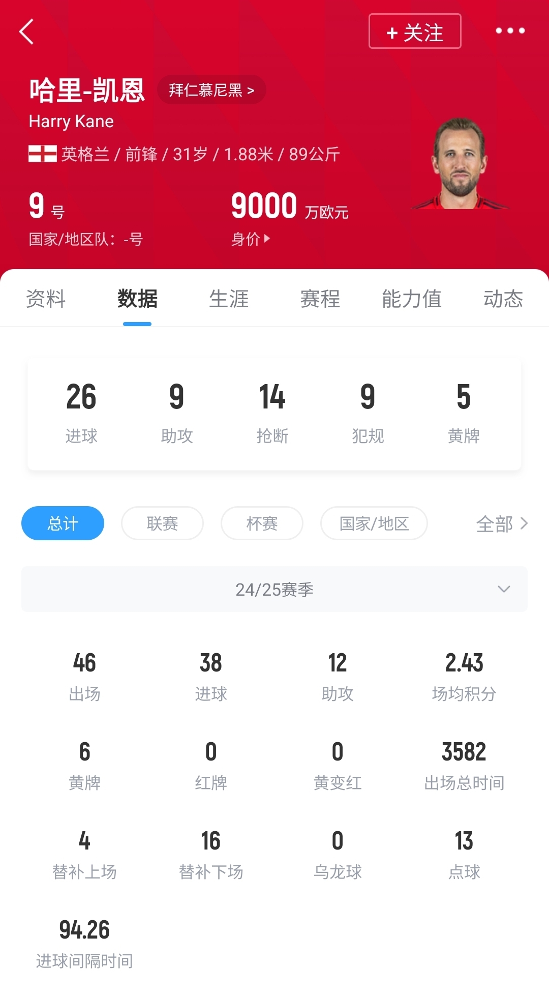 本賽季31歲的凱恩出戰(zhàn)46場(chǎng)比賽,貢獻(xiàn)38球12助,幫助拜仁拿下德甲冠軍,這也是凱恩生涯第一個(gè)重要獎(jiǎng)杯。