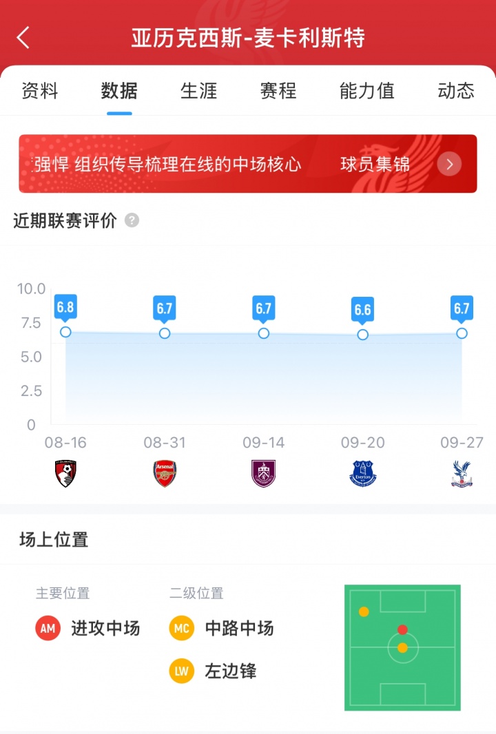 麥卡利斯特本賽季開(kāi)賽后,表現(xiàn)平平。目前2個(gè)月來(lái)的英超比賽以及兩場(chǎng)歐冠比賽沒(méi)有一場(chǎng)媒體評(píng)分達(dá)到7分。